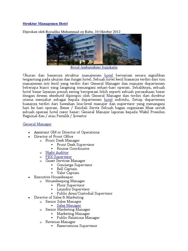 Praktek kerja magang di hotel pullman jakarta central park selama 3 bulan dari tanggal. Yaitu bagian terdepan dari hotel adalah front office department (bagian. Kelengkapan struktur organisasi tergantung pada kelas hotel, tipe hotel dan. Struktur organisasi hotel bintang 3,4,5 · 1. Terdiri dari front desk, accounting office, .
